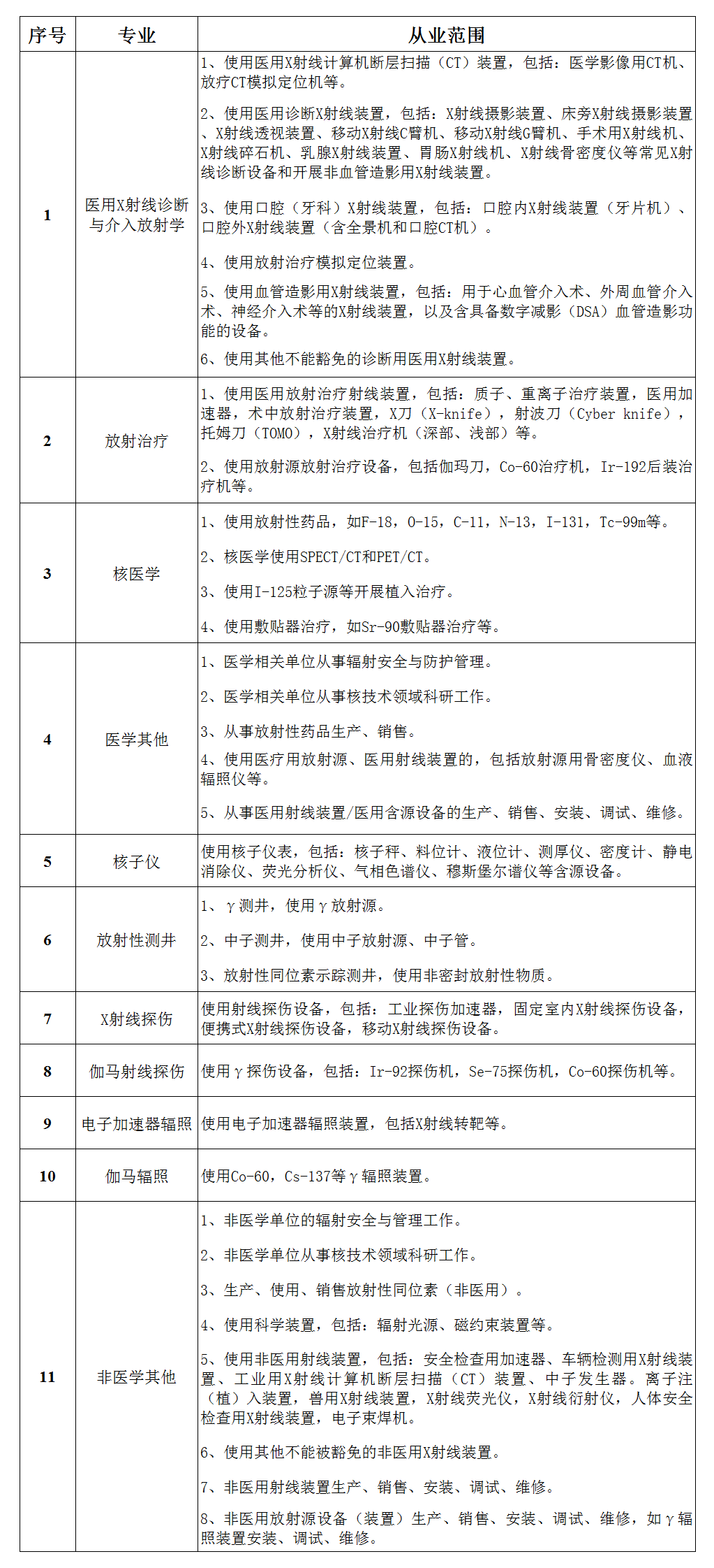 拟参加核技术利用辐射安全与防护考核的辐射工作人员可参考以下目录选择报考与所从事工作相对应的专业。辐射工作人员所从事工作不在目录中的,可选择“医学其他”或“非医学其他”。